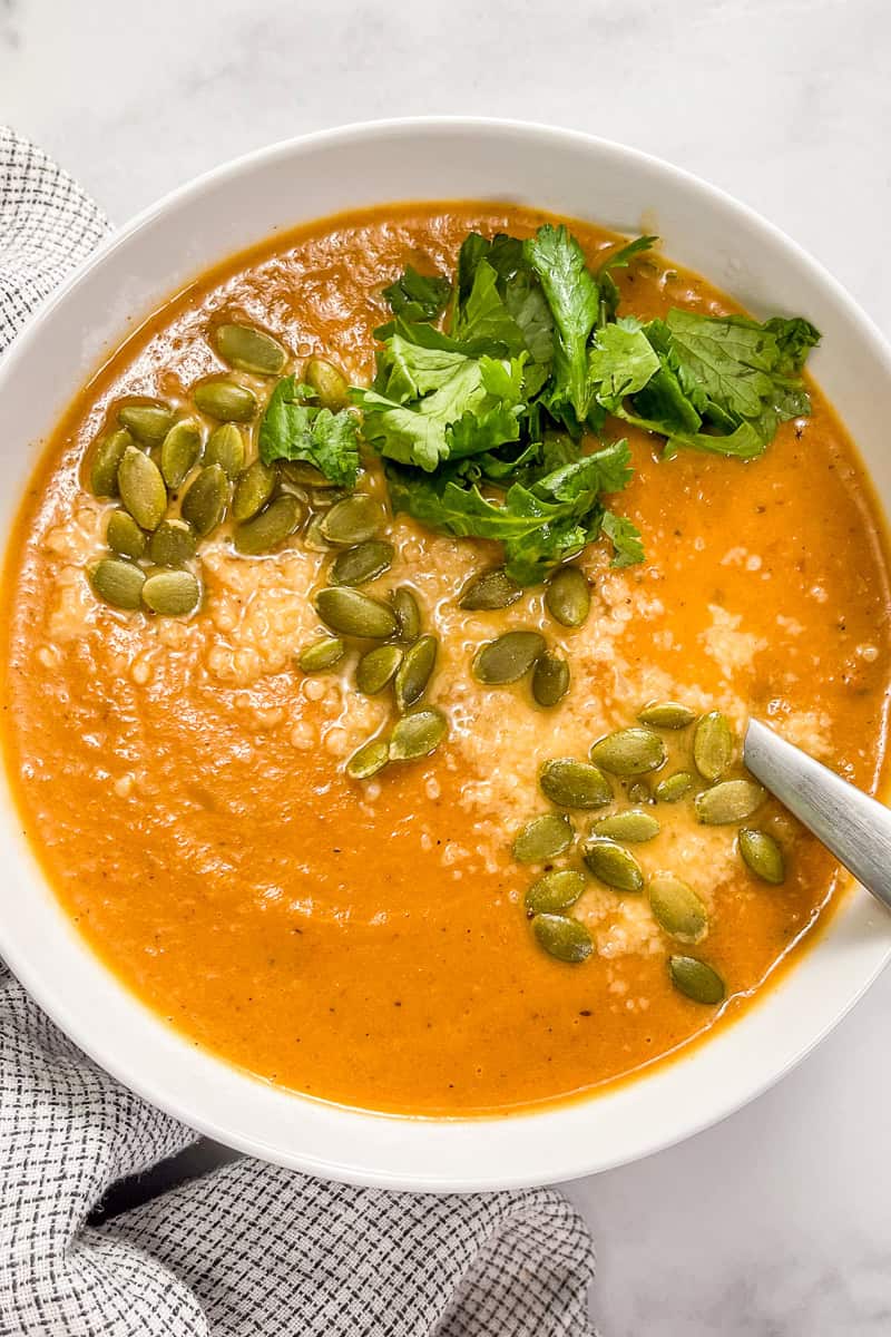 - Toppings - I recommend sprinkling grated parmesan cheese, pepitas, and chopped parsley on the soup before serving.