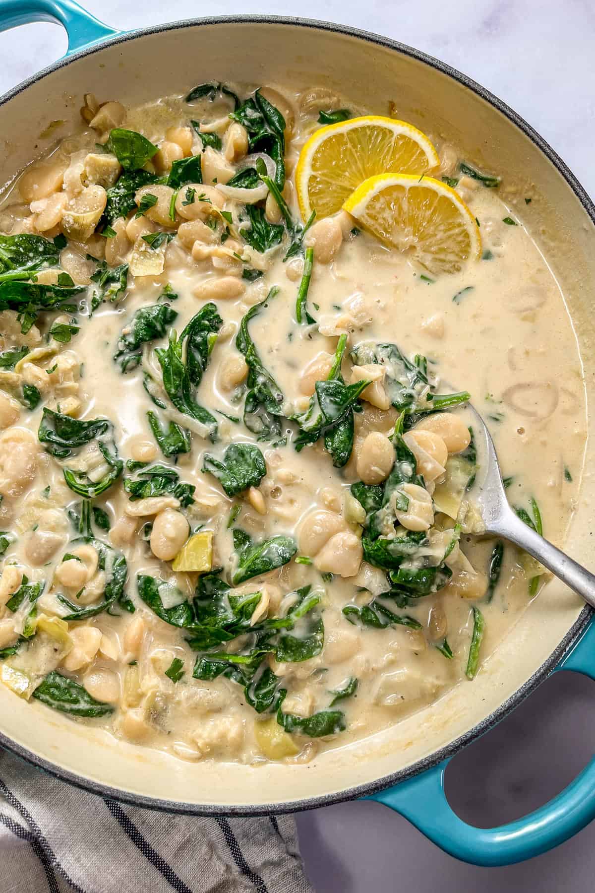 If you're a lover of spinach artichoke dip (which let's be real, who isn't?), then this is the bean dinner recipe for you! Combine some canned butter beans, aromatics, heavy cream, artichoke hearts, spinach, and parmesan for a magical meal full of flavor.