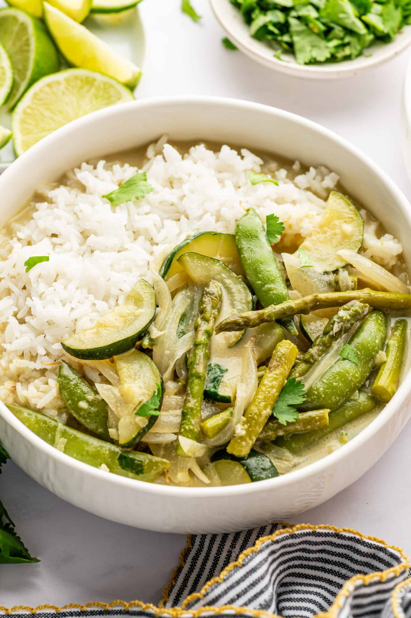 In this curry, we're using all green veggies—the combination of zucchini, asparagus, and snow peas is fantastic! This easy vegetarian Thai curry will be your new favorite weeknight meal.